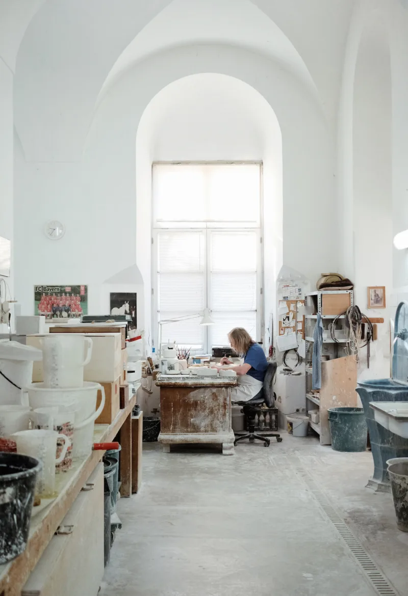 Antunes Arbeitsweise ist an den Eigenschaften des jeweils verwendeten Materials ausgerichtet: ob in Holz, Messing, Kork, Leder oder Glas orientiert sich ihr künstlerisches Schaffen stark an den durch das Material vorgegebenen Regeln. Mit der Wahl der Porzellan Manufaktur als Inspirations- und Produktionsstätte ihrer Edition erweitert Antunes ihr Material-Repertoire, wobei sie in der Produktion dieser Edition auf die langjährige Erfahrung und das Spezialwissen der Kunsthandwerker*innen vor Ort zurückgreifen konnte. Der traditionsreiche Betrieb, in dem Porzellanobjekte bis heute in reiner Handarbeit gefertigt werden, inspirierte Antunes zu ihrer Arbeit.