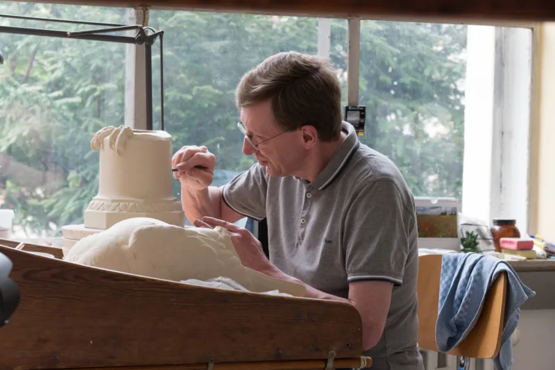 Bis zum fertigen „Porzellan-Skulpturen-Set“ waren verschiedene Arbeitsschritte notwendig. Zunächst modellierte die Formerei alle sechs Werkzeuge – stark vergrößert – in gut zu bearbeitender Porzellanmasse. Ausgehend von jenen Originalen wurden anschließend im Modellsaal entsprechende Arbeitsformen aus Gips hergestellt. In jene Formen konnte in einem nächsten Schritt flüssige Porzellanmasse gegossen werden, die die nach Trocknung und Nachbearbeitung der Oberflächen ca. 24 Stunden bei 1400°C gebrannt wurde. Nach dem Brennvorgang kamen die Porzellanobjekte in die Schleiferei zur Nachbearbeitung, um anschließend von den Porzellanmalern entsprechend der Original Werkzeuge bemalt zu werden.