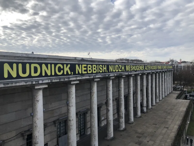 Bochner’s work consist of colloquial Yiddish terms, such as KIBBITZER, KVETCHER, NUDNICK, NEBBISH, NUDZH, MESHUGENER, ALTER KOCKER, PISHER, PLOSHER, PLATKE-MACHER(wise guy; chronic complainer; nag; sad sack; pesterer; crazy man; crotchety old man; callow person; blowhard; troublemaker), which convey a particular humor that survived the National Socialist regime, despite all odds. The banner’s colors, yellow on black, are reminiscent of the armbands and badges introduced by the National Socialists to stigmatize the Jewish population.