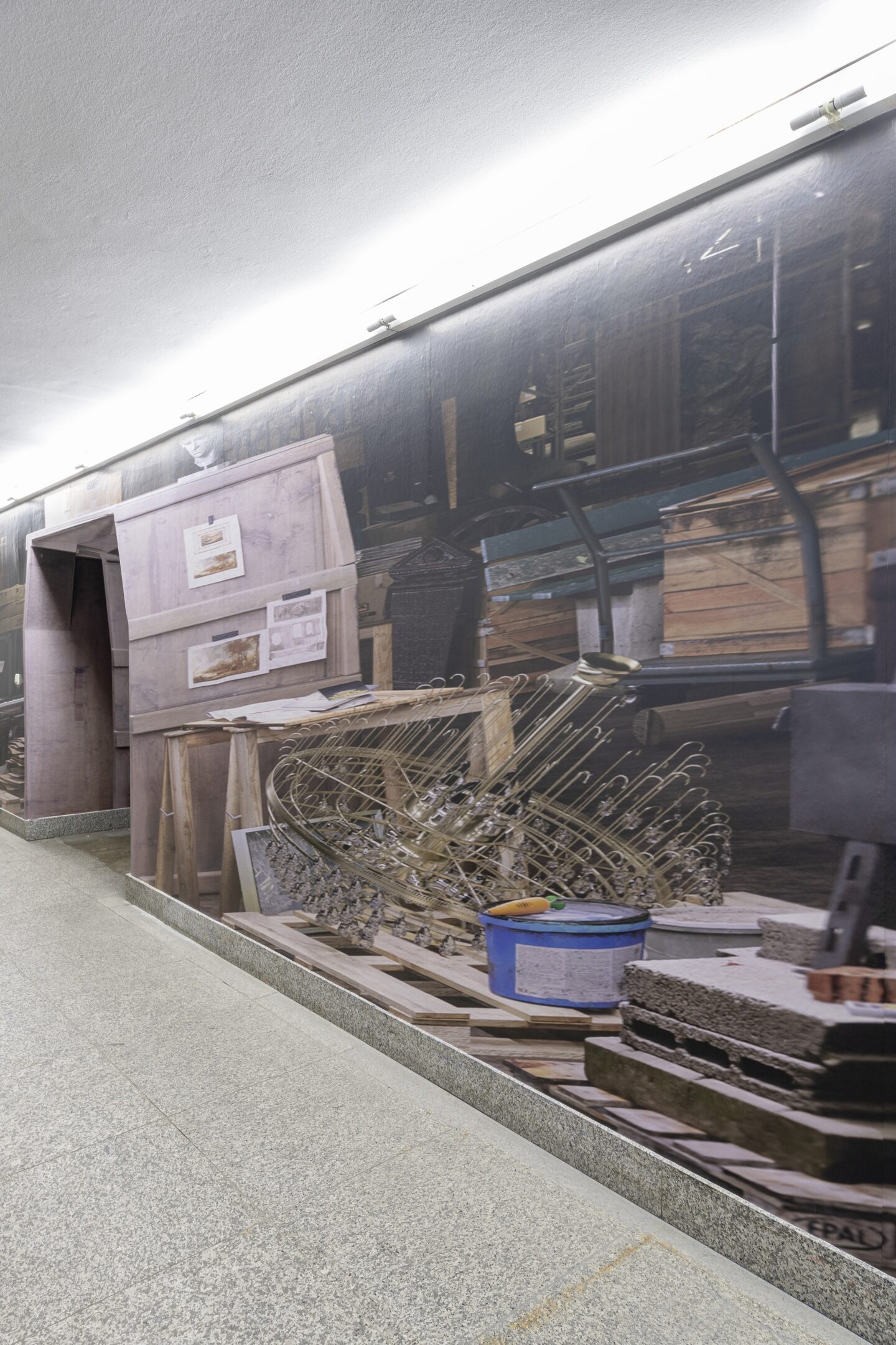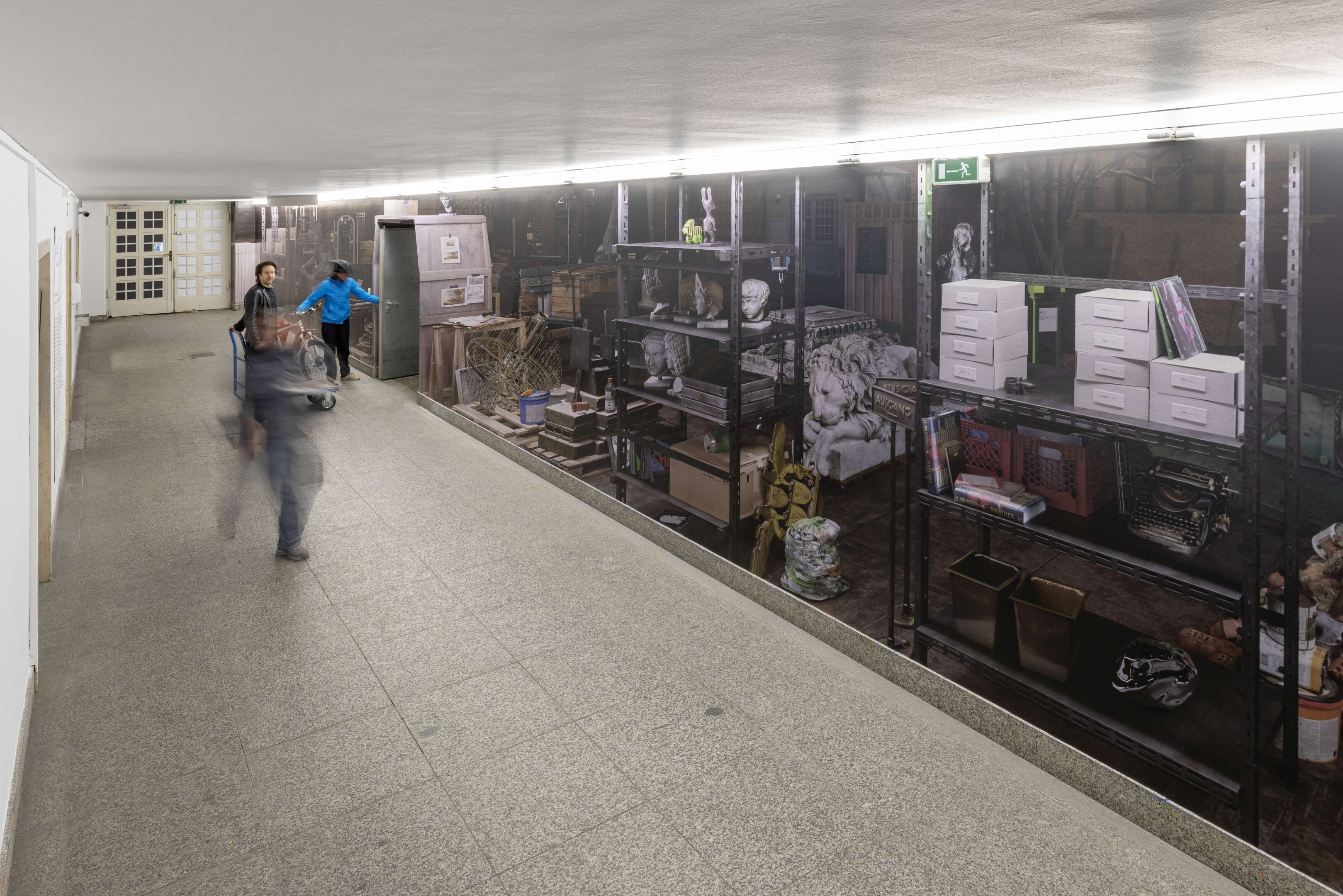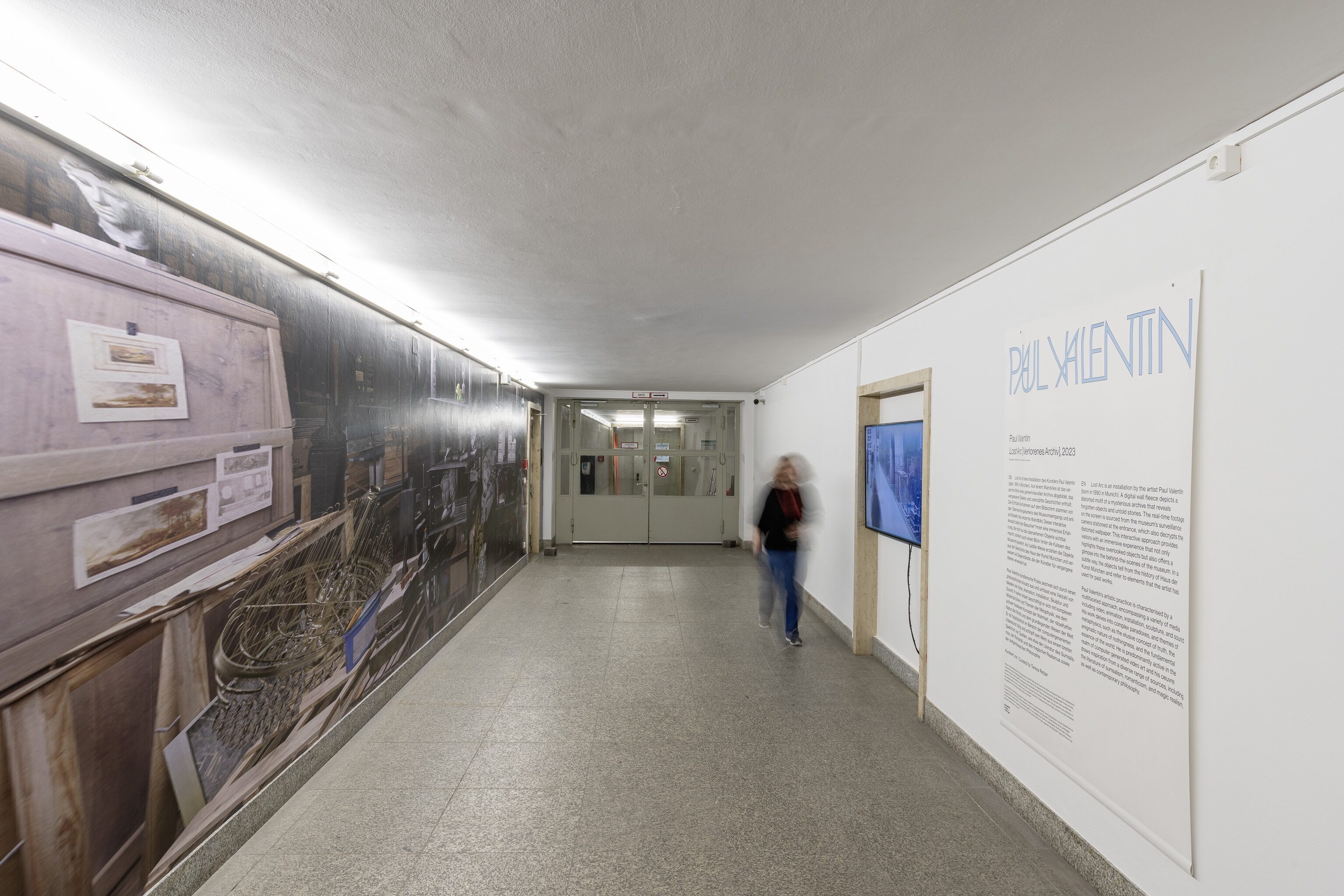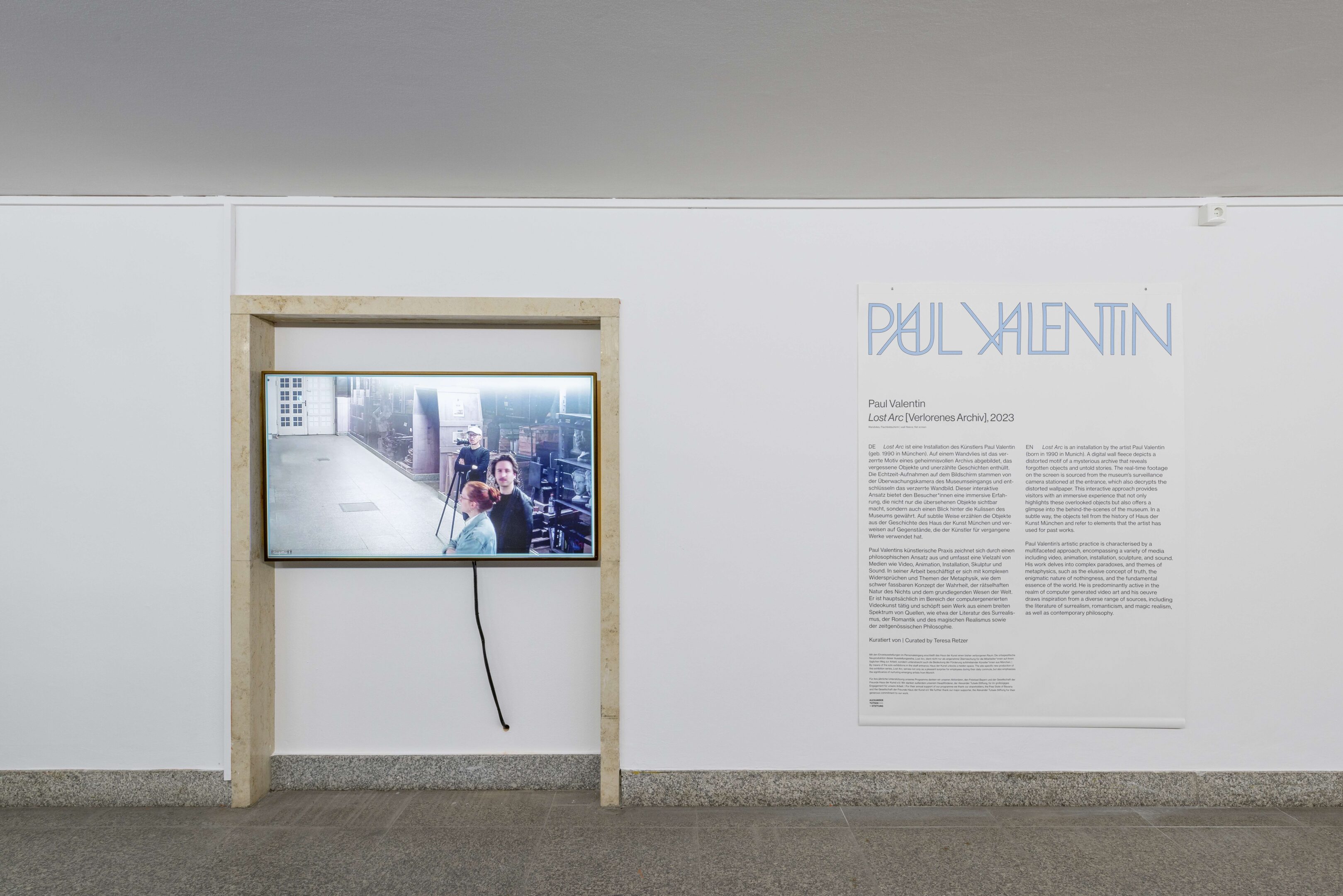 Lost Arc ist eine Installation des Künstlers Paul Valentin (geb. 1990 in München). Auf einem Digitaldruck mit Wandvlies ist das verzerrte Motiv eines geheimnisvollen Archivs abgebildet, das vergessene Objekte und unerzählte Geschichten enthüllt. Die Echtzeit-Aufnahmen auf dem Bildschirm stammen von der Überwachungskamera des Museumseingangs und entschlüsseln das verzerrte Wandbild. Dieser interaktive Ansatz bietet den Besucher*innen eine immersive Erfahrung, die nicht nur die übersehenen Objekte sichtbar macht, sondern auch einen Blick hinter die Kulissen des Museums gewährt. Auf subtile Weise erzählen die Objekte aus der Geschichte des Haus der Kunst München und verweisen auf Gegenstände, die der Künstler für vergangene Werke verwendet hat.
