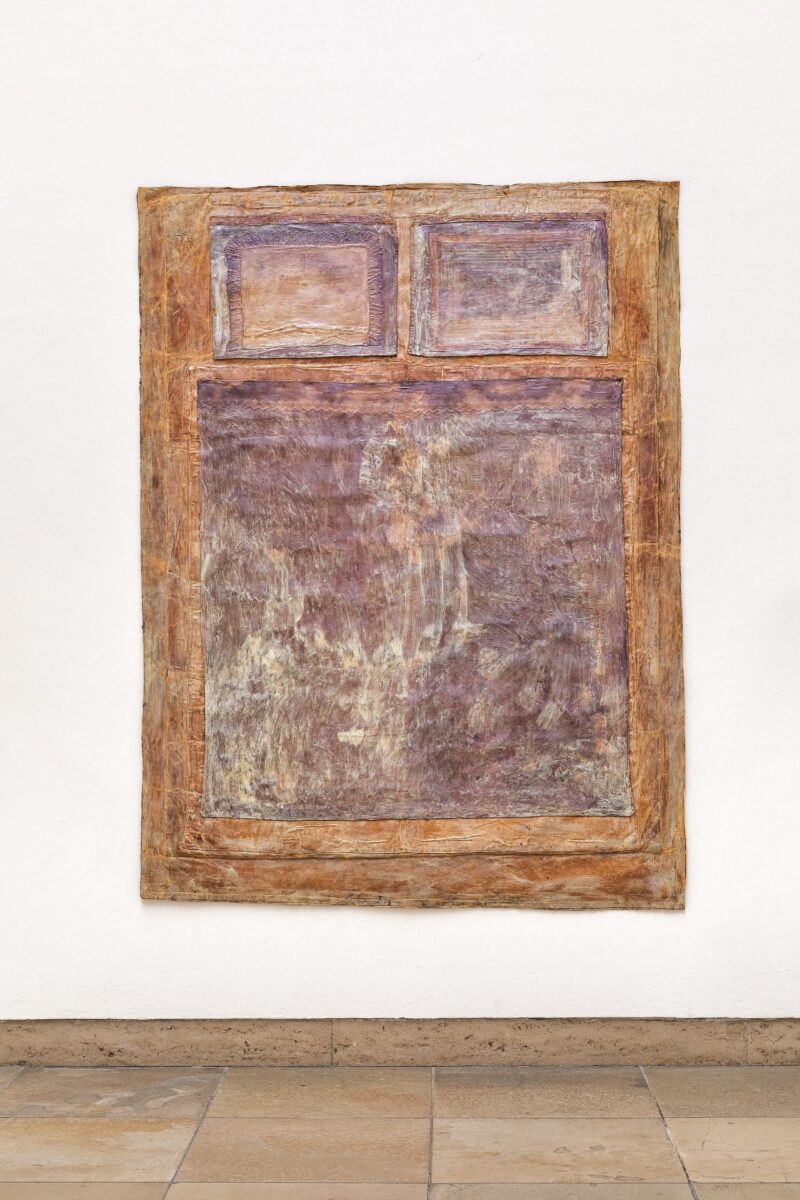 Prior to this, Bucher had already moved from the exterior to the interior at the place she named Borg, her studio in a former butcher’s shop on Weinbergstrasse in Zurich. There, at the entrance, she executed her first architectural latex skinning with “Borg” [1978; fig. 3]. She derived the name Borg from the German word “Ge-borgenheit” (safety, security); she thus created for herself a kind of personal shelter in which, between 1973 and 1978, an imagery for coming to terms with female oppression emerged in the form of the “Einbalsamierungen” (embalmings) and “Weichobjekte” (soft objects). Bucher arranged found textiles that had belonged to her family, for instance underwear, children’s and women’s clothes, or bedspreads, often covering them several times with layers of latex and adding motifs such as shells, a combination that at first glance seemed surreal. This was followed by the treatment of the latex surfaces with motherof- pearl, purple or gold pigments, which initially appeared to remove the works from reality, but instead ultimately opened up new spheres of interpretation.