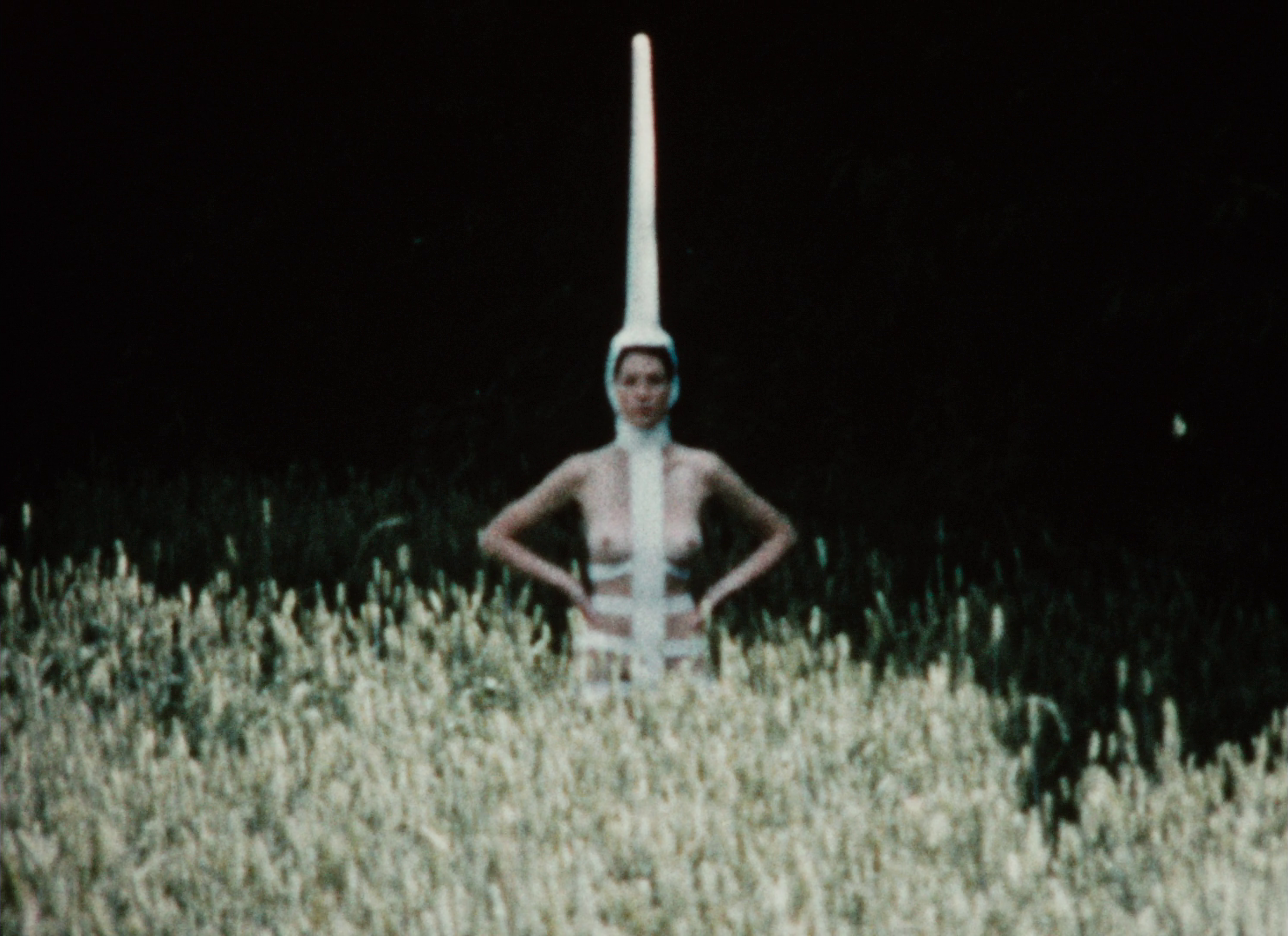 When the gigantic horn is mounted on the performer’s head in Head Extension (1972), his body needs to adjust. It is wavering, still tethered to the ground but unstable.