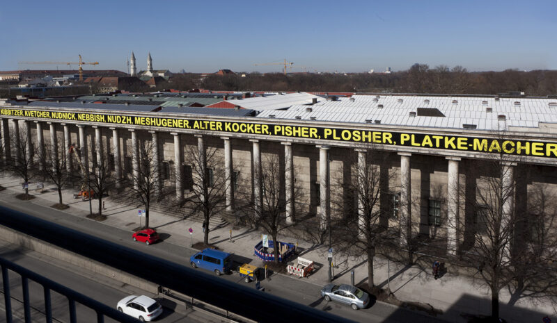 In the yellow and black work The Joys of Yiddish from 2006, which Bochner has mounted on Haus der Kunst façade, the artist also makes use of the tension that arises from the text's content and the use of color. Here, the language of the victims in the Third Reich's Jewish ghettos is linked to the perpetrators' colors – the yellow and black armbands the victims were forced to wear.