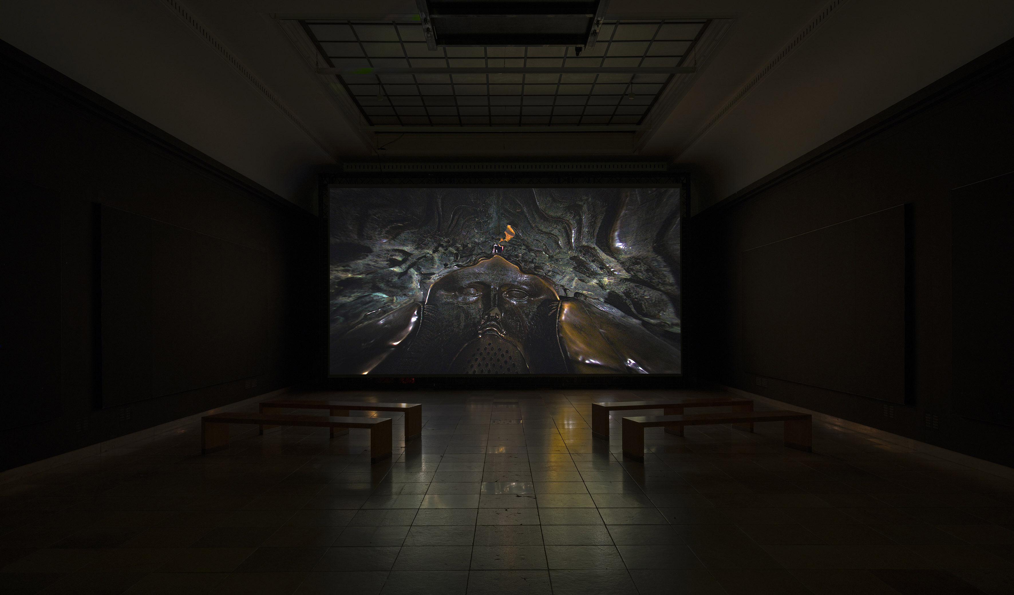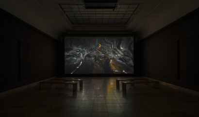 With Wassermusik, Haus der Kunst presents the new exhibition by Cyprien Gaillard (b. 1980, Paris, France). At the centre of the exhibition is the artist’s latest stereoscopic motion picture Retinal Rivalry (2024), co-produced by Haus der Kunst. By harnessing cutting-edge technology, Gaillard offers an expanded, sharpened vision of the world around us. This key work leads viewers on a journey through folded time and inaccessible urban surfaces: dumpsters and subterranean arteries, humid landscape, and views through the eyes of the Bavaria statue at Oktoberfest. It thus enters into a close dialogue with the city of Munich and its folk festival, having it linger on as if in a strange memory, disrupting conventional perception with a sculptural and psychedelic space, and dissolving the narrative to reveal pure vision.